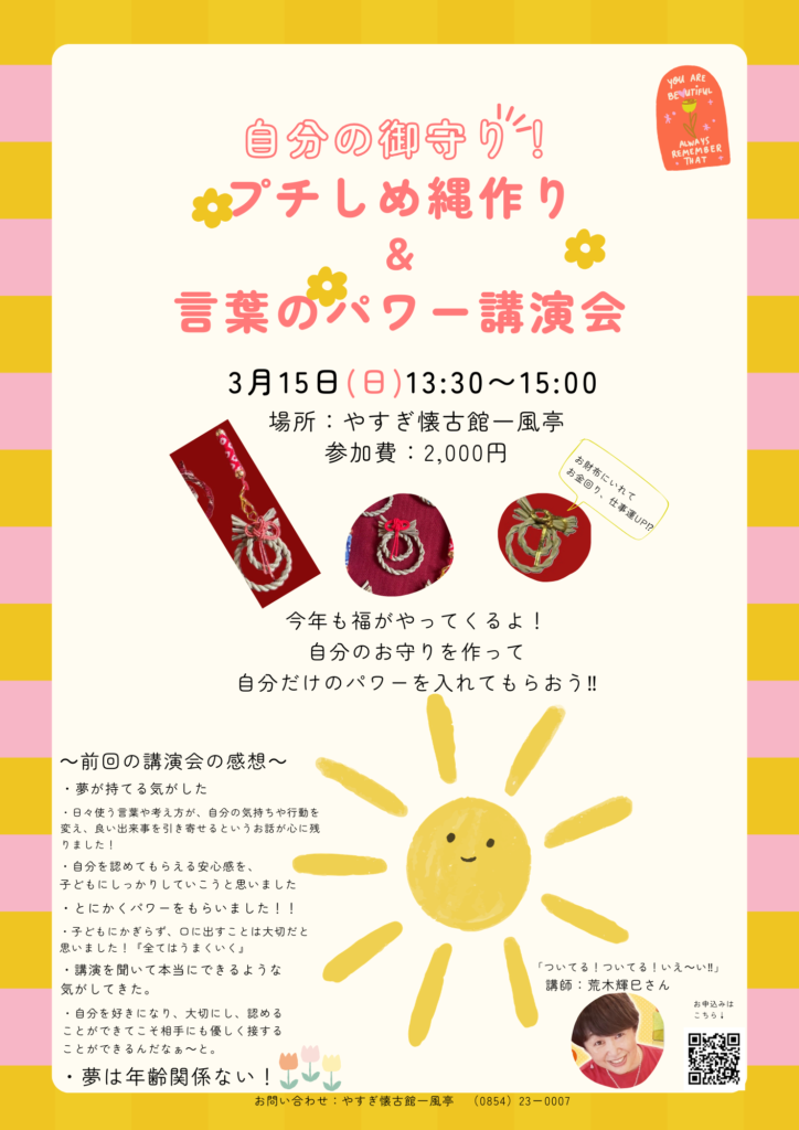 荒木輝巳さんのしめ縄作りワークショップです♪自分だけのパワーを入れてもらいます。お財布に入れてたら、お金回り、仕事運がUPした方も(@ ̄□ ̄@;)!!しめ縄の後30分は、てるみさんの元気が出るお話会で、自分の言葉のチェック!!
